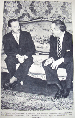 O Duque de Bragança e o Presidente da República do Brasil Dr. Getúlio Vargas no Palácio do Catete e com o Ministro das Relações Exteriores do Brasil , Embaixador Oswaldo Aranha no Palácio Itamaraty.